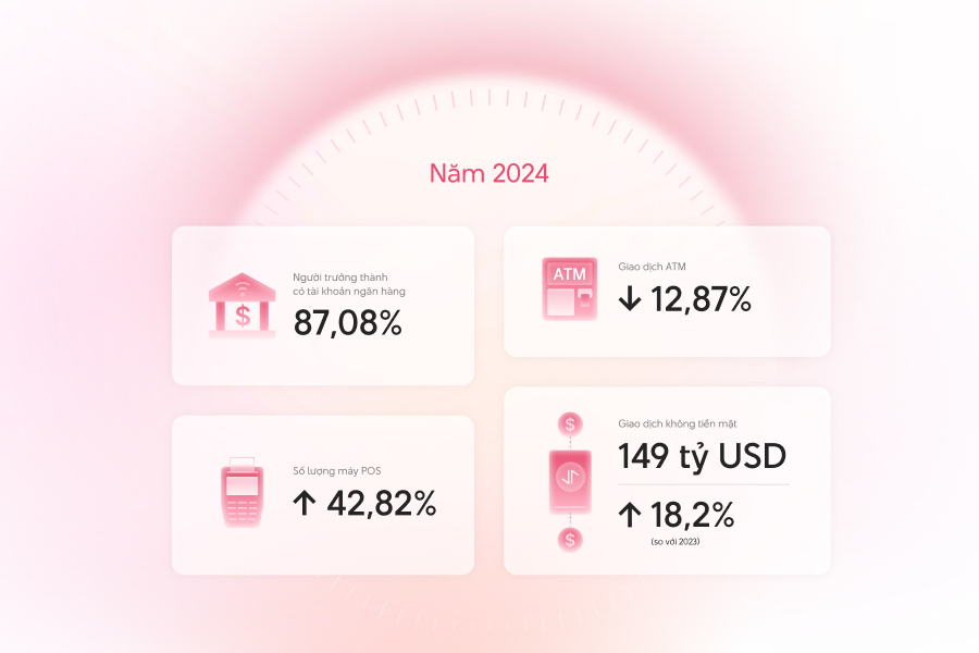 Theo dữ liệu từ Ngân Hàng Nhà Nước, trong năm 2024 đã chứng kiến số lượng lớn của người trưởng thành có tài khoản ngân hàng, đạt 87,08%. Số liệu này cho thấy qua việc đẩy mạnh công nghệ mở tài khoản online, nay ngân hàng Việt đã có thể tiếp cận với một lượng lớn khách hàng từ các vùng nông thôn, nơi mà việc di chuyển đến các chi nhánh ngân hàng gặp nhiều khó khăn. Số liệu thống kê đến hết tháng 11/2024 cho thấy số lượng máy POS tăng 42,82%, cùng với đó số lượng giao dịch qua máy ATM giảm 12,87% so với cùng kỳ năm 2023. Những số liệu này cho thấy việc rút tiền mặt đang trở nên ít phổ biến hơn và được tháy thế bởi những thói quen thanh toán không tiền mặt.